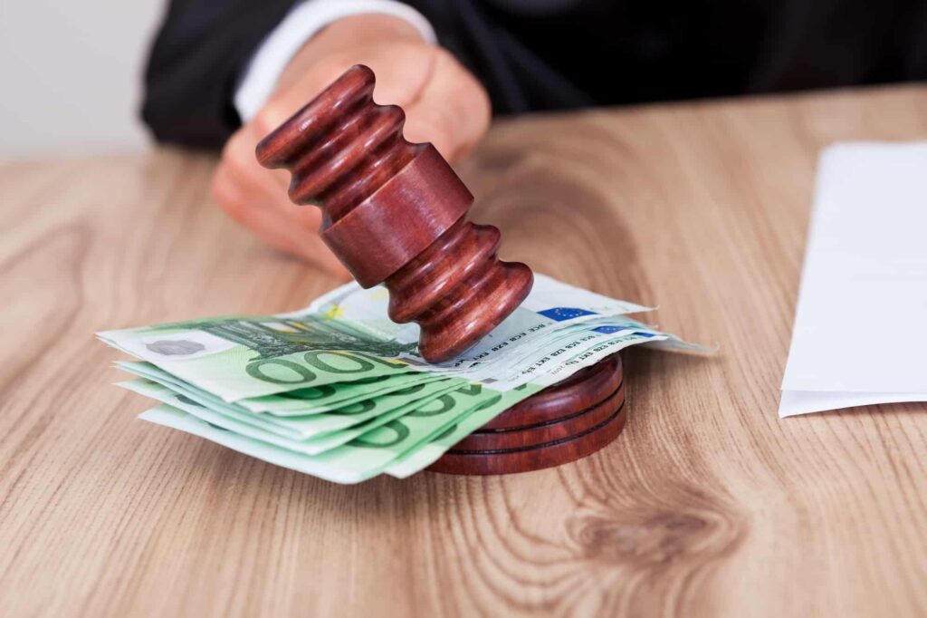 Male Judge Striking The Gavel Euro Note In A Courtroom